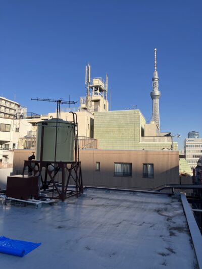 今回は給水設備、高架水槽の交換工事です。 場所はスカイツリーのすぐ近く。見晴らしは良いですが、柵の無い現場なので安全第一で施工していきます。