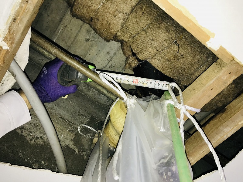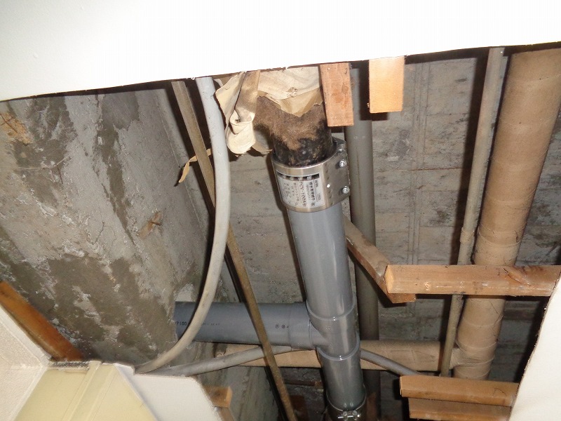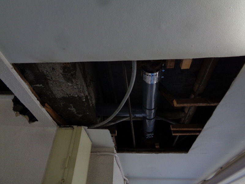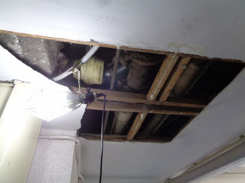 排水管漏水事故発生の為補修工事のご依頼があり漏水箇所の調査を行いその後漏水箇所の更新工事を行いました。 既設配管は、鋳鉄管でエルボ部分から漏水があり、居住者の方がビニール袋で漏水箇所の応急処置対策を行ってくださっていました。 そして今回の工事で更新した新設配管については、塩化ビニール管(VP)を使用し、新設配管と既設配管の繋ぎ替えの部分は SAジョイントを使用し施工いたしました。 また工事の際に天井の解体も行ったため、こちらに関しては垂木で基礎を作ってから天井板を設置し、その後塗装作業を行い工事完了となりました。 築年数が経過していくとこのような配管からの漏水事故が発生してしまい、作業までそのままの状態でいることになるため築年数が経過している建物では 不具合が出る前に改修工事を行う事をおすすめいたします。