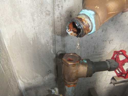 給水管の保温材を剥し腐食状態を確認。 腐食により漏水が発生していました。
