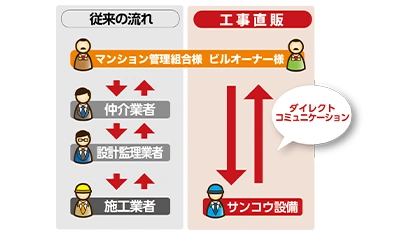 工事直販とは、ビル・マンションの水道設備工事の際、施主であるマンションの管理組合やビルオーナーの方が、仲介業者を介さずに工事を依頼する考え方です。直接コミュニケーションすることで、時間短縮による目に見えないコストが大幅に削減できます。
